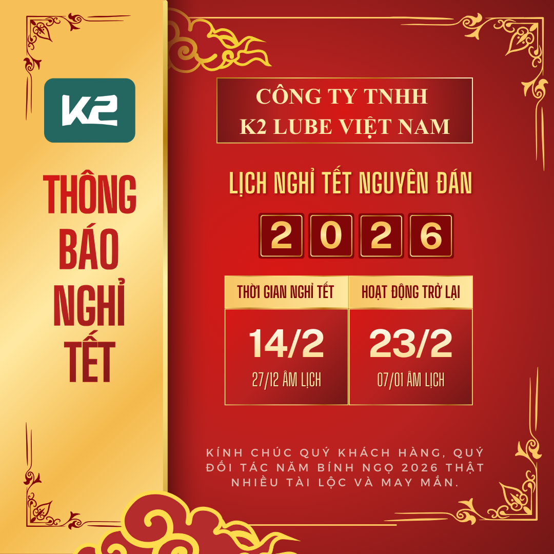 Nhà máy Dầu Mỡ K2 Lube thông báo thời gian nghỉ Tết 2026
